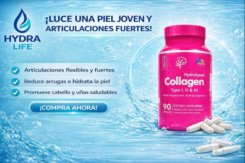 Colágeno Hidrolizado Hydra Life (90) Cápsulas: Colágeno Premium con Ácido Hialurónico